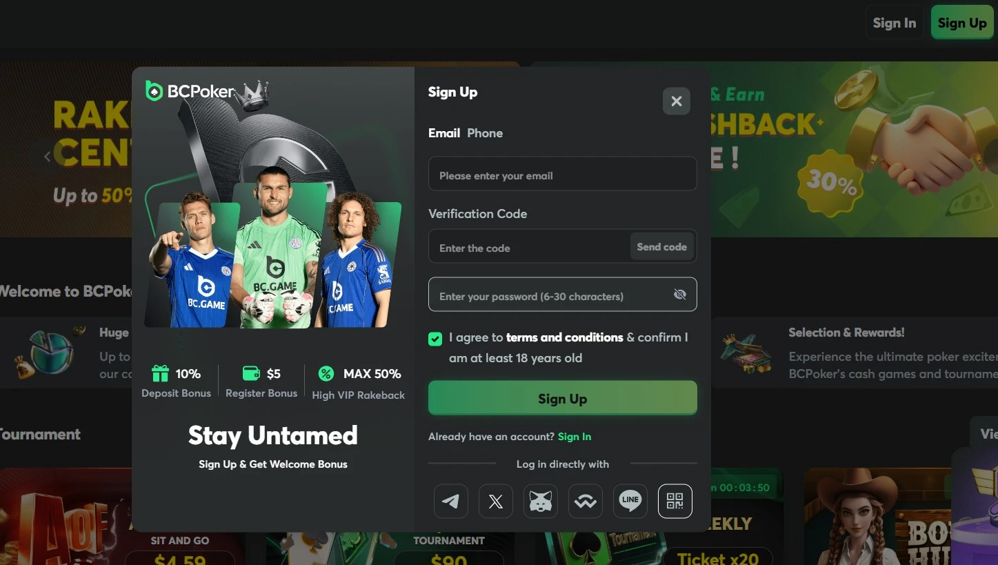 Окрім стандартної реєстрації, у BCPoker доступні й альтернативні способи швидкого входу. Користувачі можуть створити акаунт або авторизуватися за допомогою Telegram, соціальної мережі X, а також через MetaMask, Crypto Wallet або LINE. Відповідні іконки розміщені на тій самій сторінці реєстрації під кнопкою "Sign Up". Після вибору одного з варіантів система запропонує пройти стандартну процедуру авторизації та підтвердити дані, дотримуючись підказок на екрані.