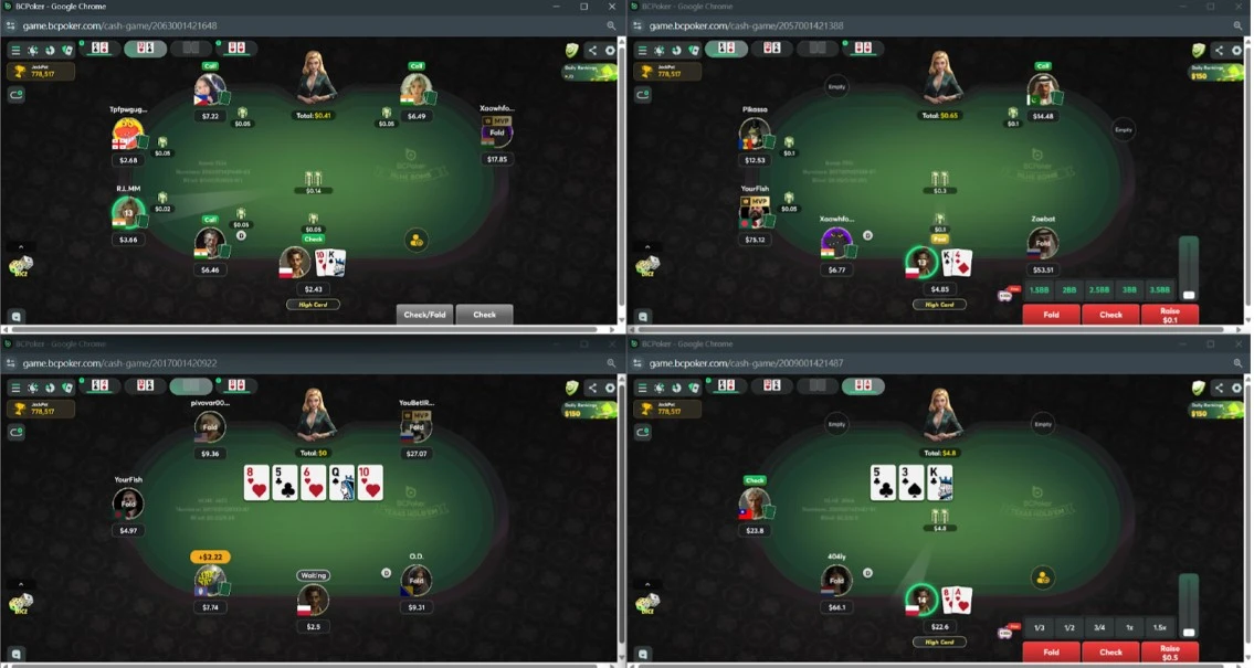 Окрім турнірів, у BCPoker доступні кеш-ігри з лімітами від $0,02/$0,05 до $100/$200, що дозволяє поєднувати турнірну гру з класичними кеш-сесіями в межах одного клієнта.