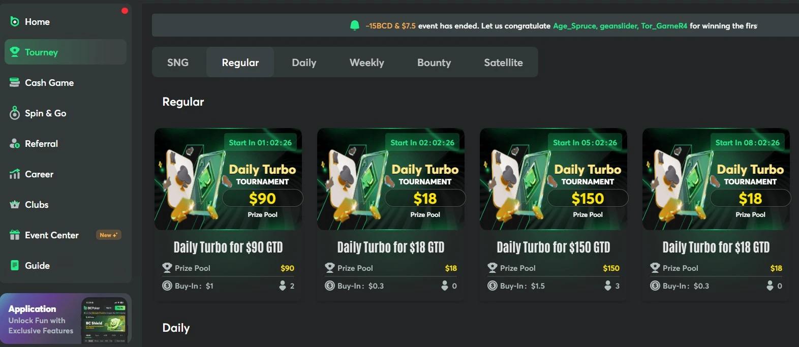 Окрім вітальних місій, у BCPoker запроваджена система Daily Check-In. Користувачі, які заходять в акаунт кожні 24 години, отримують випадкові винагороди. Це додатковий стимул регулярної активності навіть без великих депозитів.