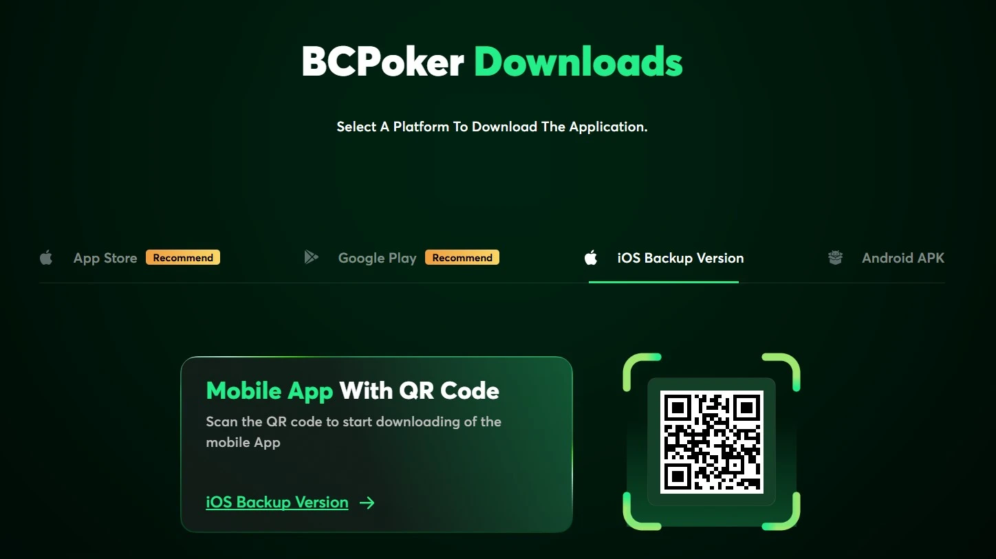 Мобільний застосунок BCPoker доступний для Android та iOS, зокрема для iPhone та iPad. Завантажити його можна через App Store, Google Play або з офіційного сайту руму. Для цього на головній сторінці необхідно натиснути кнопку Download у правому верхньому куті, після чого з мобільного пристрою просканувати QR-код і перейти до відповідного магазину застосунків для встановлення.
