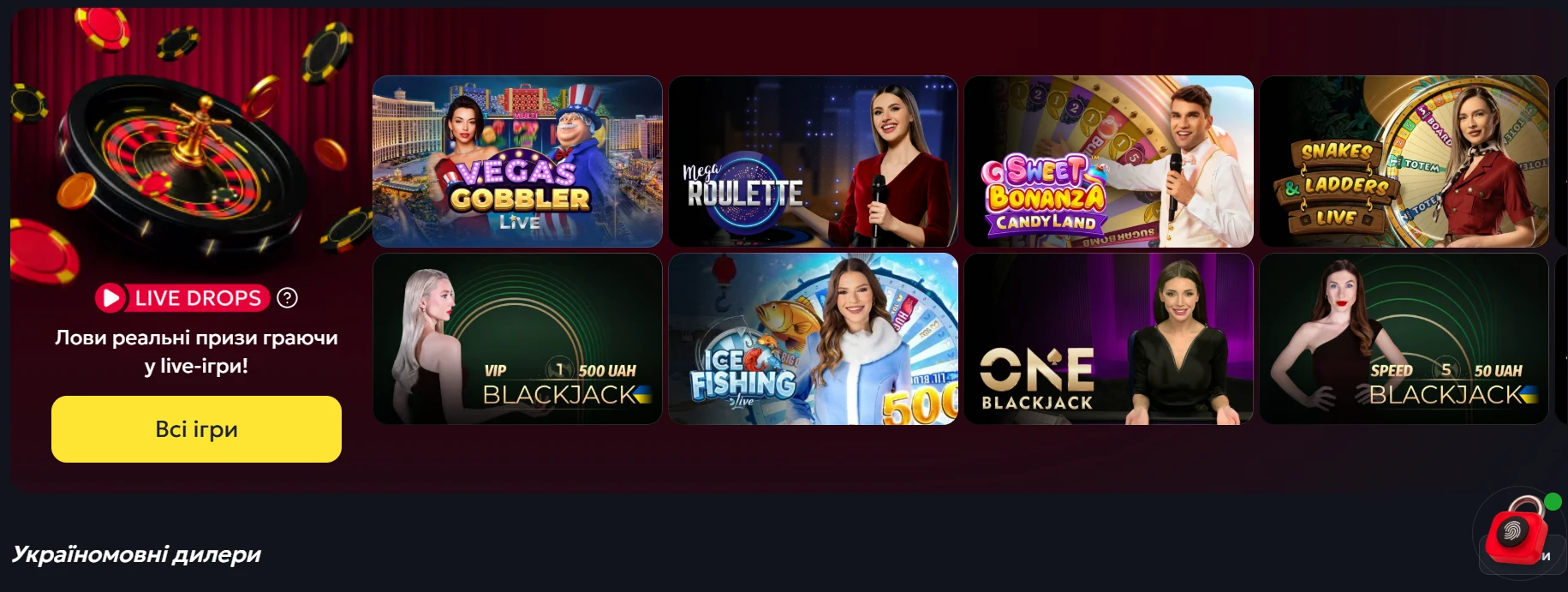 - Живі дилери (Live Casino). Прямі трансляції з ігрових залів, де користувач взаємодіє зі справжнім круп'є. Цей розділ вимагає стабільного та швидкого інтернет-з'єднання для безперебійного потокового відео.