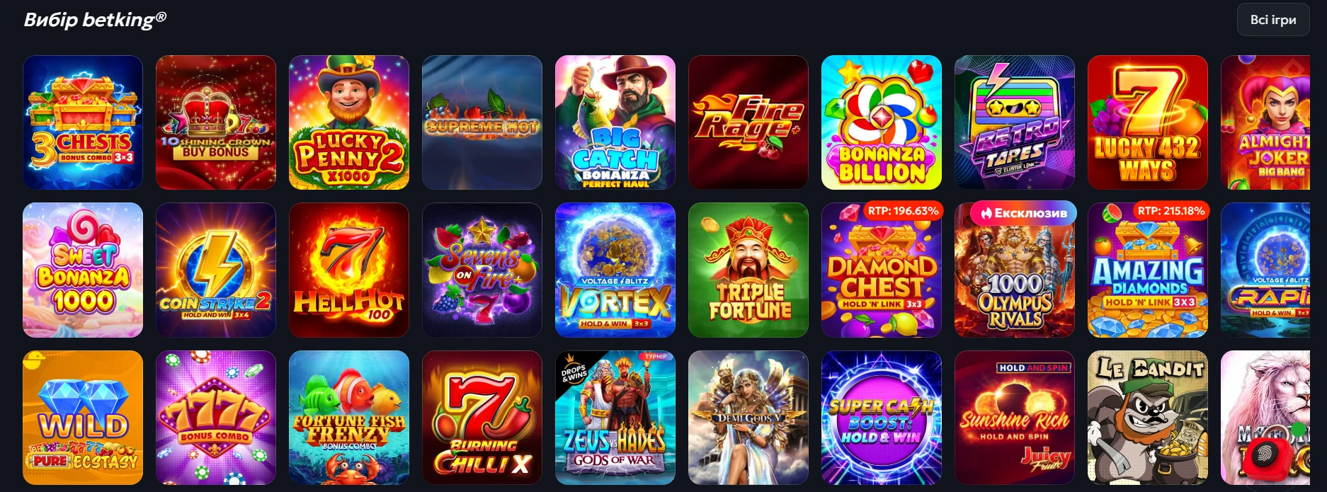 Слоти в Betking складають понад 80% усього ігрового асортименту. Вони інтегровані в єдину екосистему разом із: