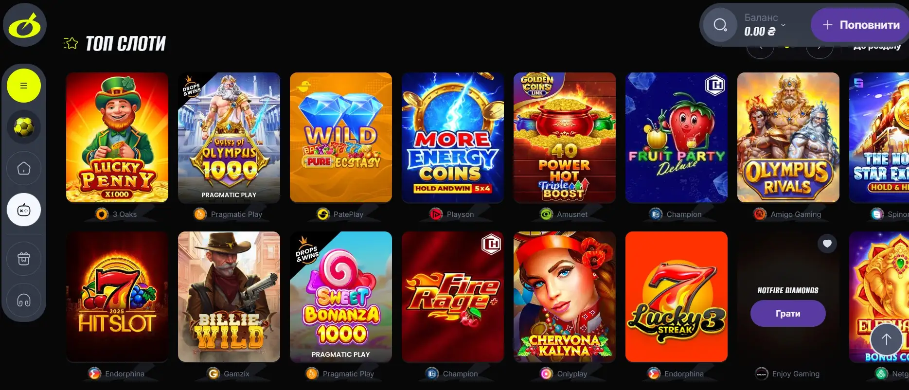 - Топ-слоти – ігри, які демонструють найвищу популярність серед гравців платформи.