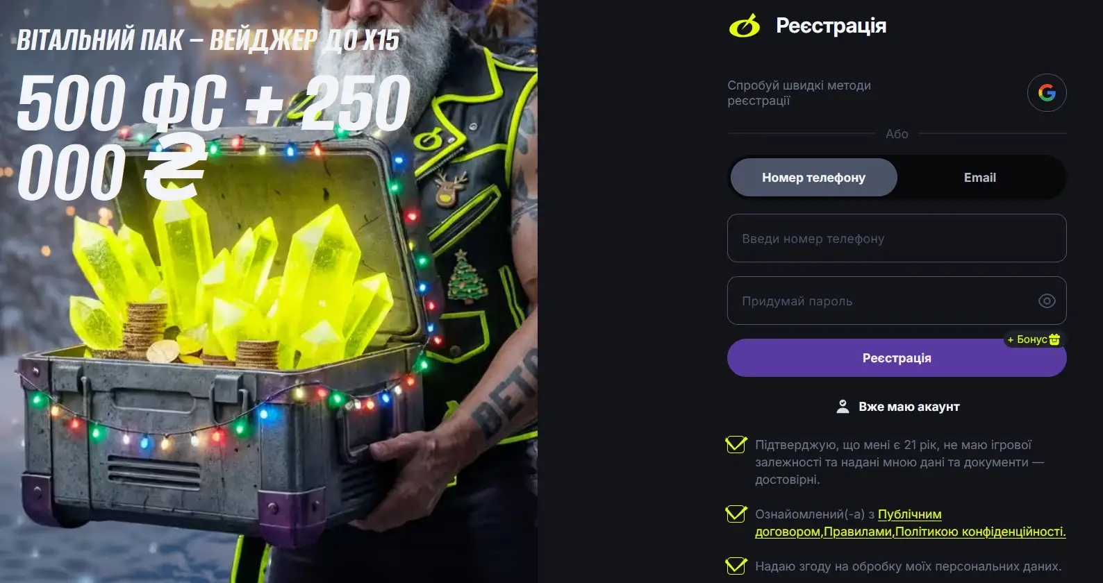 Після цього користувачеві необхідно підтвердити, що йому виповнився 21 рік, що він ознайомлений з правилами користування сервісом, публічним договором і політикою конфіденційності, а також надати згоду на обробку персональних даних шляхом встановлення відповідних позначок. Завершується процес натисканням кнопки "Реєстрація".