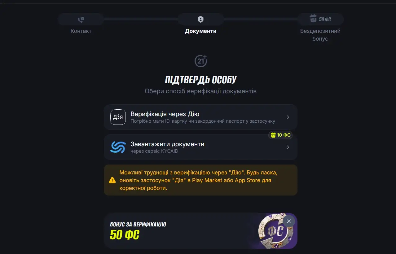 Найшвидший спосіб підтвердження особи - використання державного застосунку "Дія". Для цього необхідно мати ID-картку або закордонний паспорт, додані до застосунку. Після підтвердження даних інформація автоматично передається до системи казино, що значно скорочує час перевірки.
