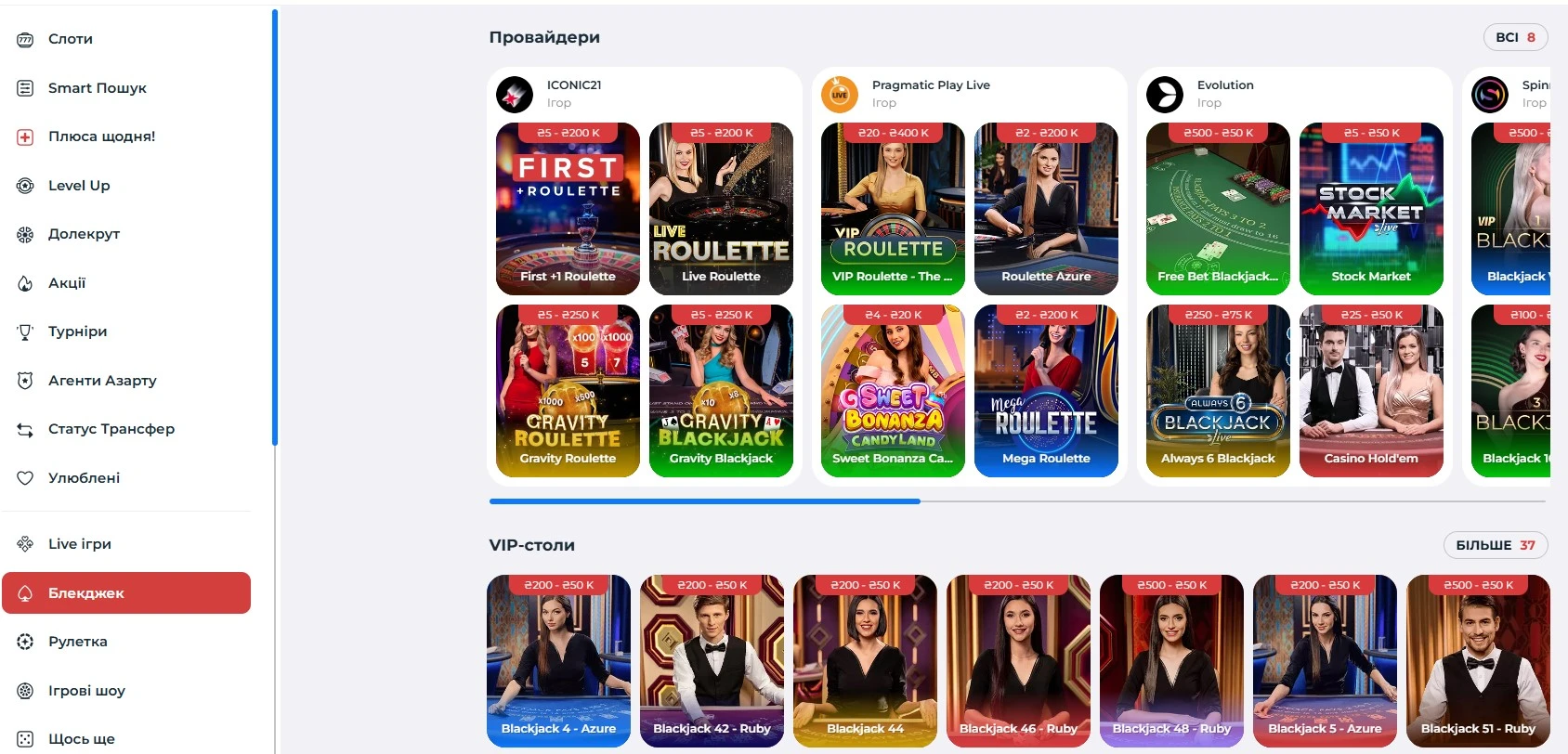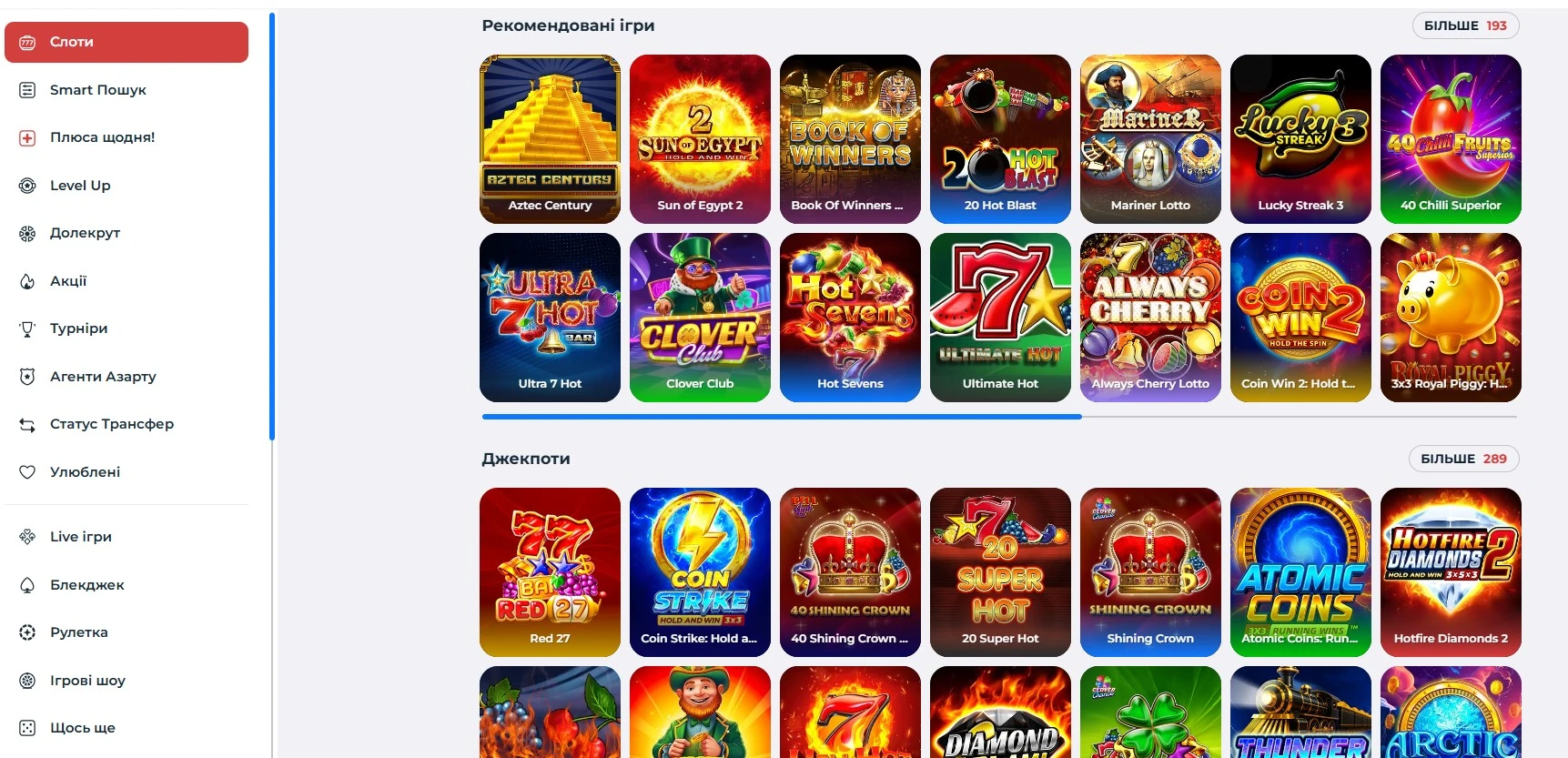 У каталозі представлені класичні слоти, сучасні відеослоти, автомати з бонусними функціями, джекпот-ігри та новинки від різних провайдерів.