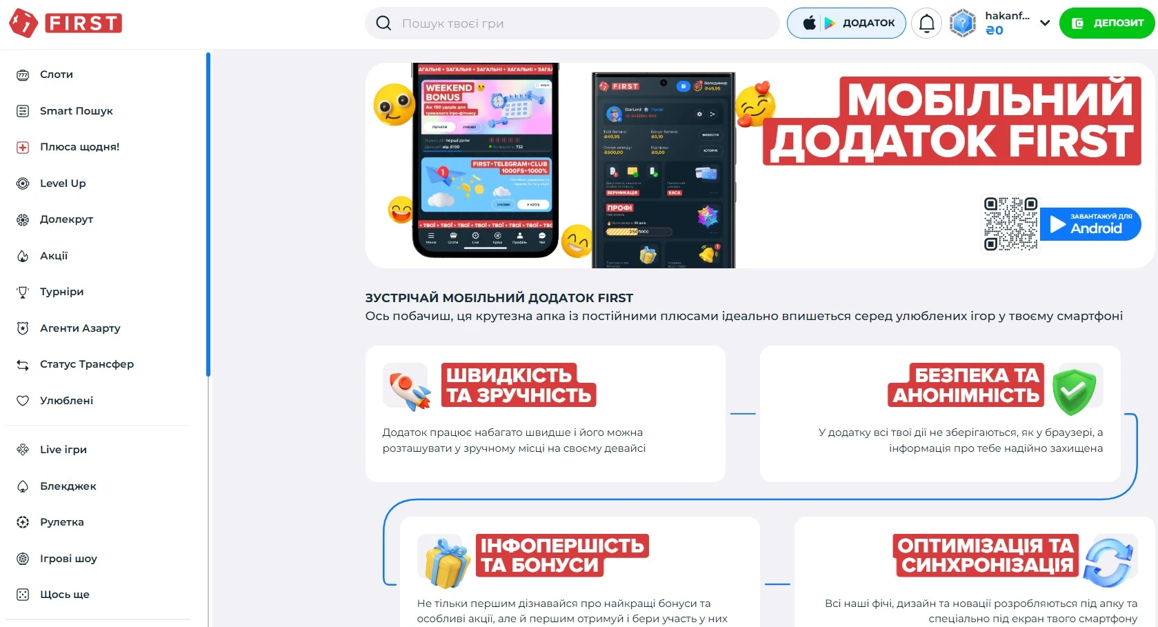 Слоти First Casino можна запускати з телефону через мобільну версію сайту, яка відкривається в браузері. Достатньо зайти на сайт, авторизуватися за потреби та перейти в розділ слотів.