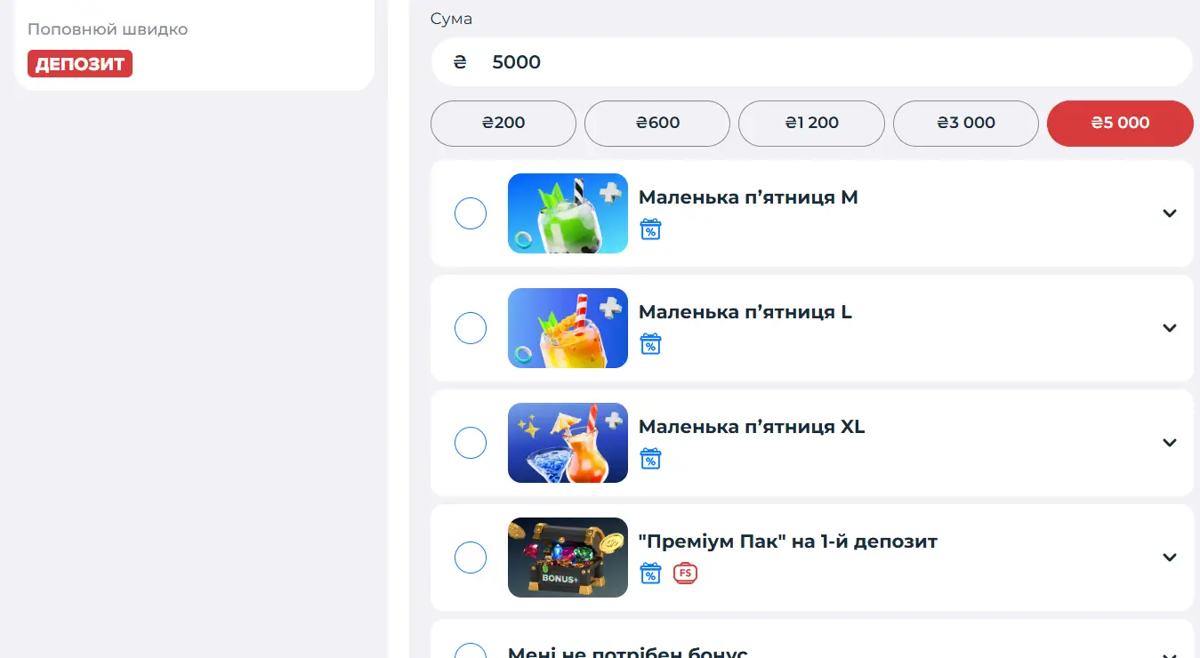 Також бонуси автоматично пропонує система під час депозиту: