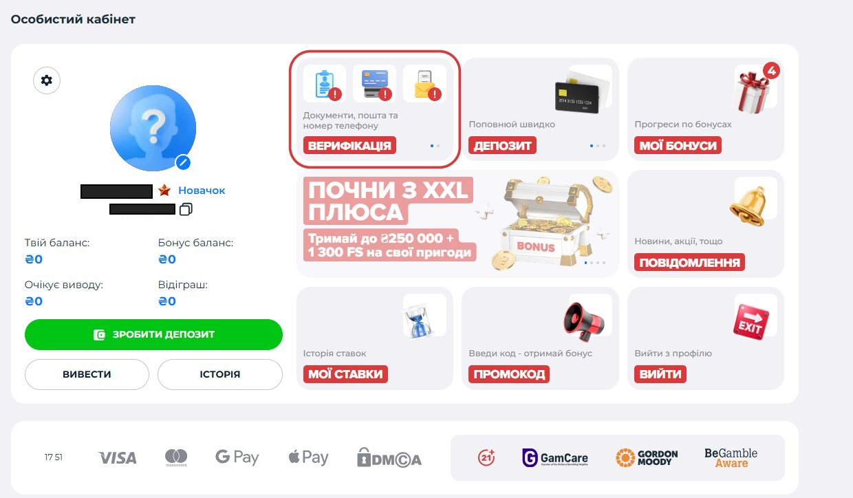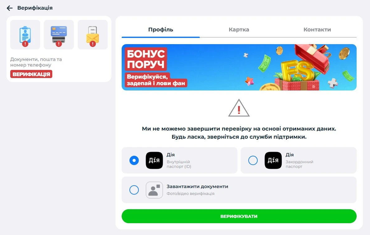 Так, верифікація є обов’язковою. Ба більше, пройти її потрібно ще до першого поповнення рахунку, оскільки без підтвердження особи платформа не допускає користувача до фінансових операцій.