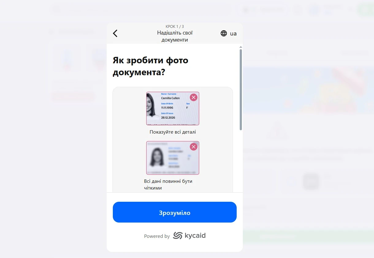 Перший варіант – ручна верифікація документів. У цьому випадку користувач завантажує через офіційний сайт або мобільний застосунок фото одного із документів, що посвідчують особу. Ідеться про ID-картку, закордонний паспорт, посвідку на постійне проживання або внутрішній паспорт. До зображень висуваються стандартні вимоги: документ потрібно тримати рівно, розмістити на однотонному фоні, подбати про достатнє освітлення та переконатися, що текст і фотографія чітко зчитуються.