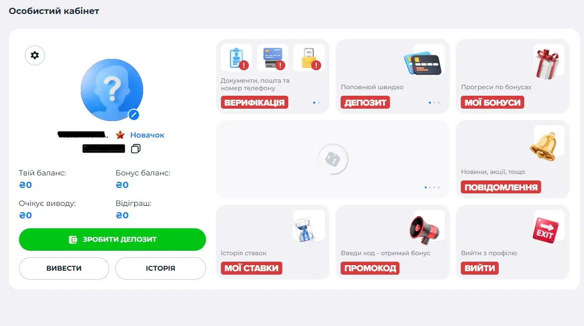 Щоб перейти до налаштувань профілю, потрібно натиснути на нікнейм із відображенням балансу, який розташований у правому верхньому куті сайту поруч із кнопкою поповнення рахунку. Після цього відкривається меню з деталізованою інформацією про баланс (основні кошти, бонусні кошти, сума до виведення, відігравання), а також кнопка переходу до профілю. Саме в особистому кабінеті знаходиться розділ, необхідний для проходження верифікації.