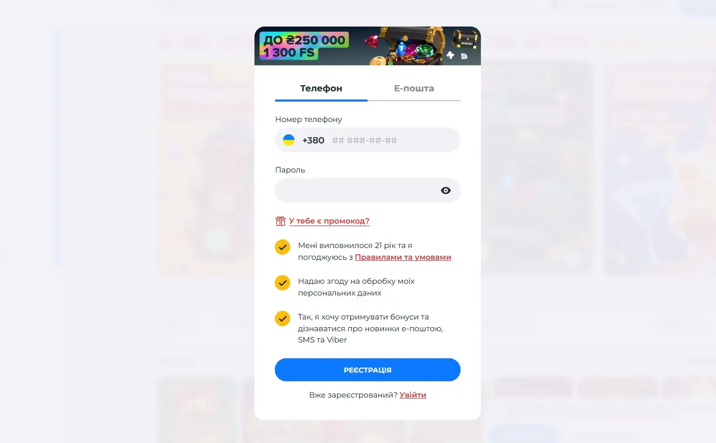За замовчуванням система пропонує реєстрацію за номером телефону, однак користувач може змінити спосіб у будь-який момент, обравши відповідну вкладку у формі.