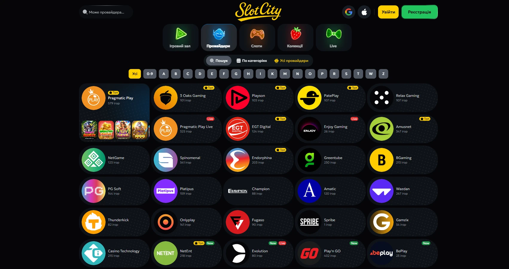 Провайдер – це компанія, що займається розробкою ігор для онлайн-казино. Деякі спеціалізуються виключно на слотах, інші – на live-іграх. Наразі на Slot City представлено 57 провайдерів. Нижче подано п’ятірка найкращих провайдерів за версією Слот Сіті.
