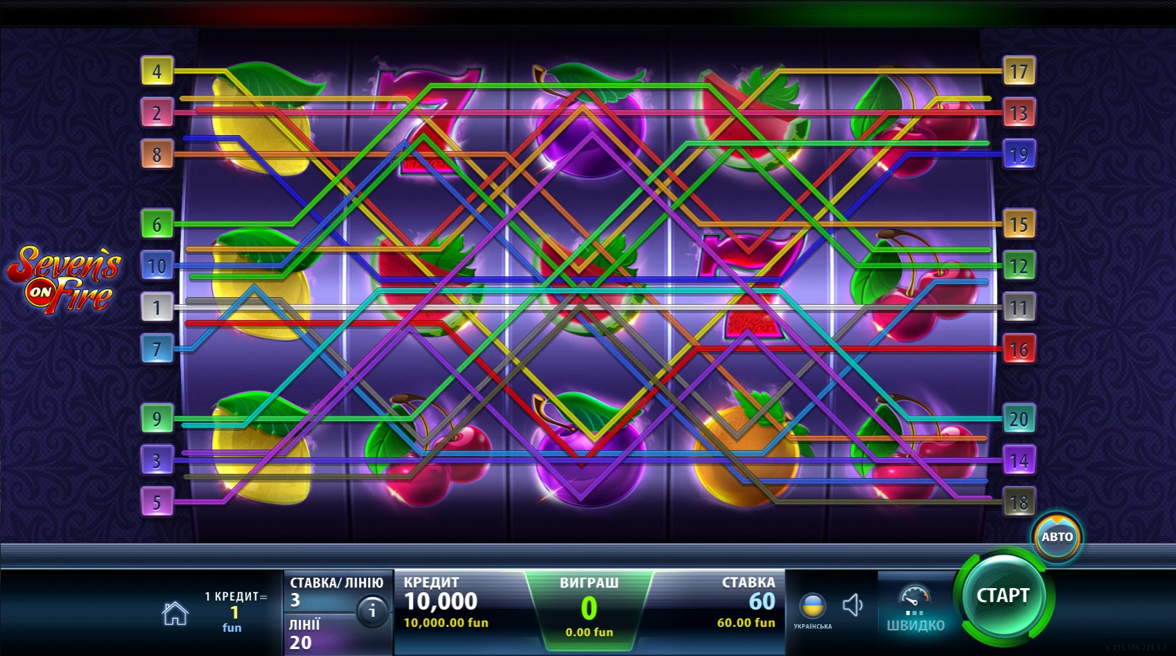 Наприклад, якщо ставка на лінію становить 3 грн, а активовано 20 ліній, то загальний спін коштуватиме 60 грн.
