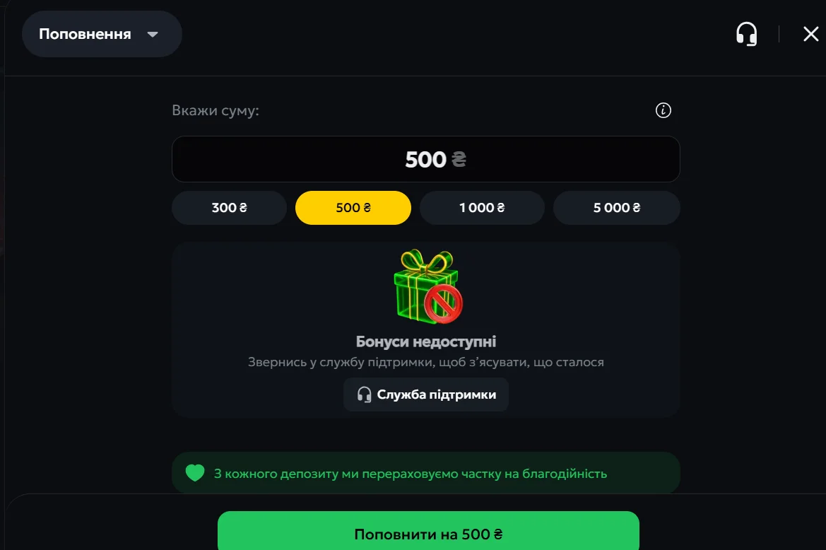 Мінімальний депозит складає 100 гривень для всіх основних методів оплати.