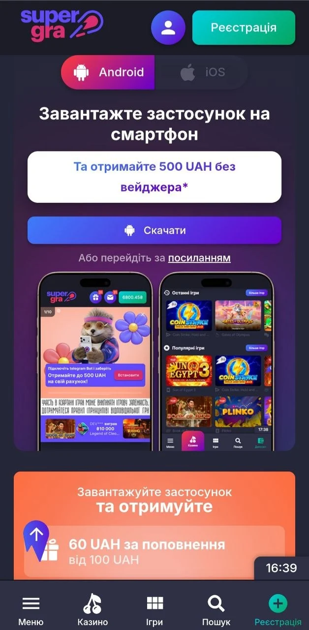 Насамперед потрібно перейти на офіційний сайт оператора казино. Якщо користувач заходить із мобільного браузера, система це розпізнає і може одразу запропонувати скачати SuperGra додаток для Android або перенаправити на сторінку в App Store. Якщо ж сповіщення про можливість завантаження не з’явилося або гравець відвідує сайт із комп’ютера, потрібно перейти до розділу «Застосунок» у головному меню сайту.