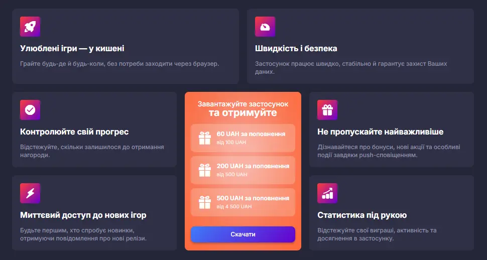 Функціонал додатка дає змогу швидко зареєструватися, пройти верифікацію та зробити перший депозит. Вибір розваг справді великий, зокрема: