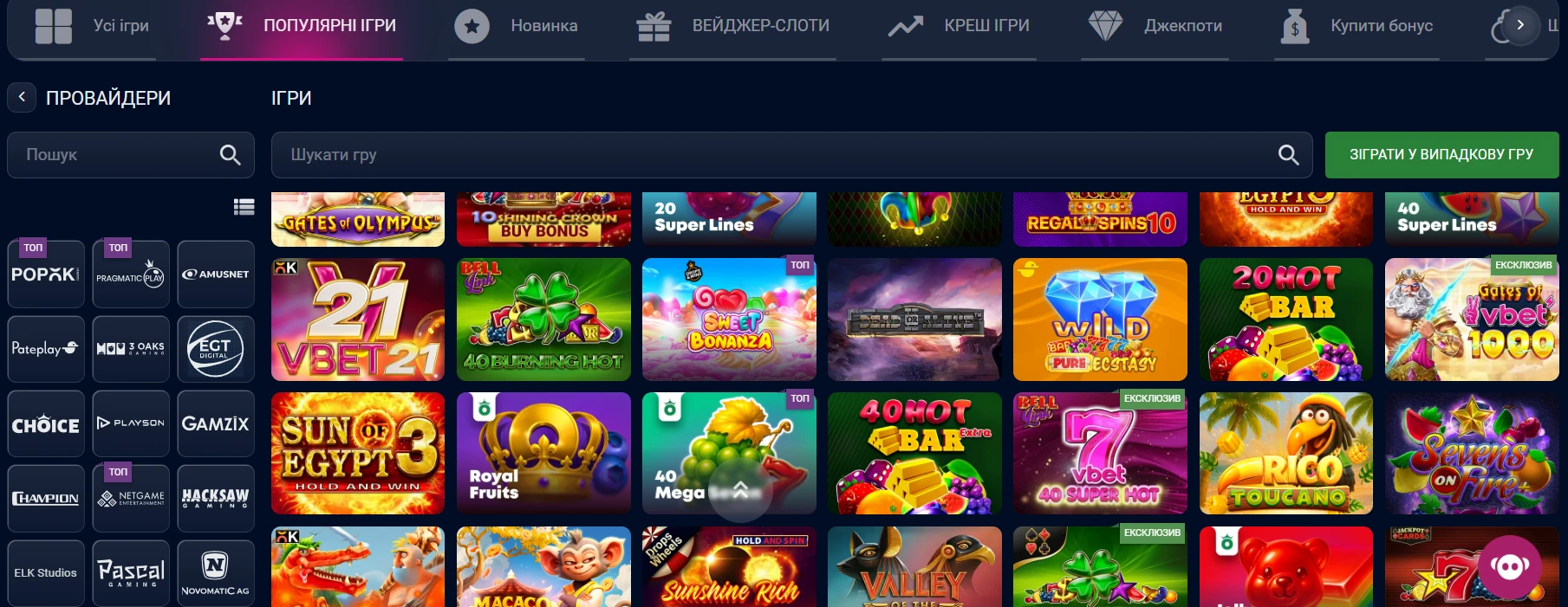 Платформа Vbet / Вбет поєднує букмекерський та казино-напрямки, а також має окремий розділ зі слотами на українському ринку. У пошукових сніпетах офіційних сторінок VBET Україна прямо зазначається, що розділ слотів містить ігри від популярних провайдерів (зокрема Pragmatic Play, Red Tiger та інших), а також доступні акції/промо для казино-напрямку.