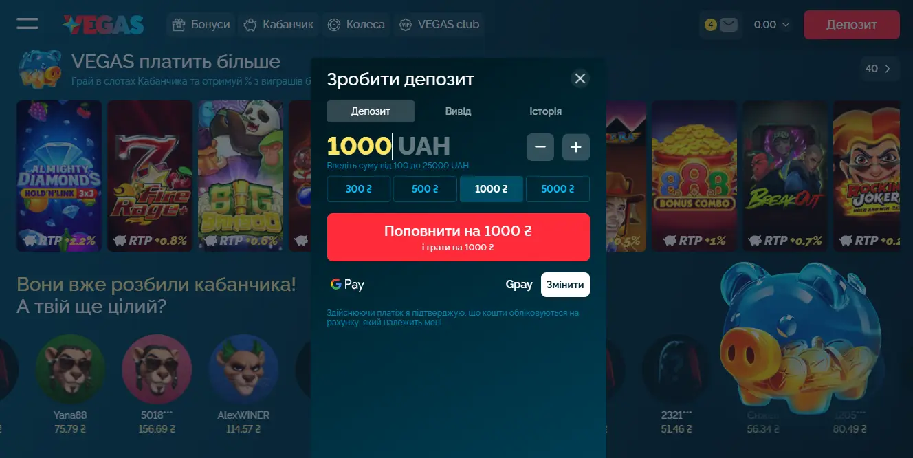 - Google Pay – дає змогу внести депозит за кілька секунд без ручного введення реквізитів картки.