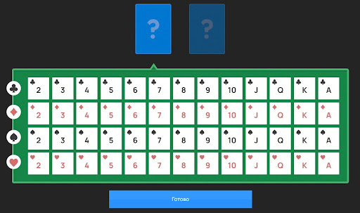 Спочатку потрібно обрати власні карти. Для цього натисніть на прямокутні сині поля у вигляді карт зі знаком питання. Після натискання відкриється повний список із 52 карт колоди. Оберіть відповідну карту, повторіть дію для другої карти та натисніть "готово".