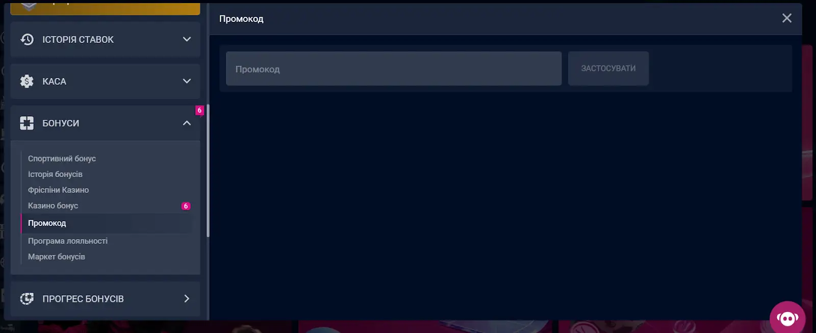 - Вкладка «Бонуси». Це ваш центр управління всіма акціями. Тут є спеціальне поле з написом «Введіть промокод».